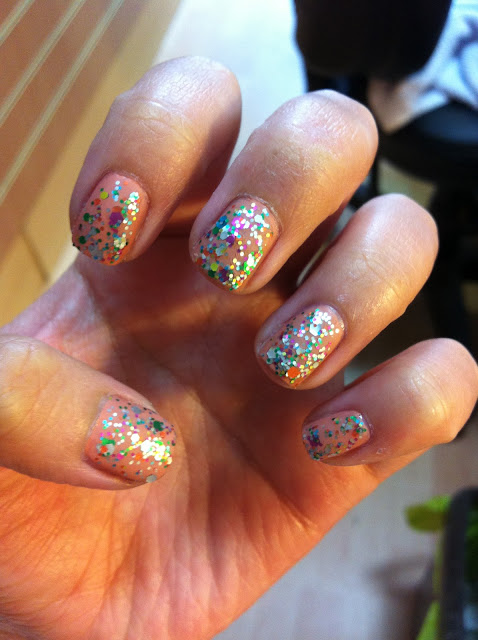 I used Essie's Nutmeg as a base colour and then OPI Rainbow Connection (glitter polish) on top. Then to tone down the sparkliness of it all I used Essie's Matte About You Top Coat. I really like the effect of the matte top coat on top of the glitter. It really brings out the colours and makes it look a bit more grown up. I'm not a massive fan of sparkly nails but I would definitely rock this again!
